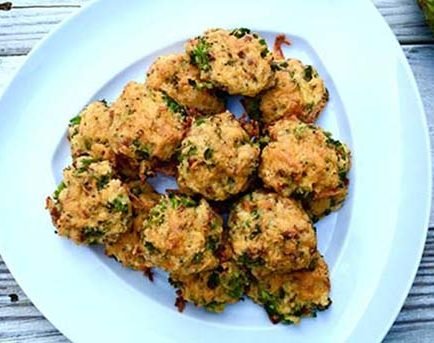 Cook fresh chopped broccoli for 2-3 minutes in the microwave. In a large bowl, mix together all ingredients until well incorporated and bread crumbs have absorbed the egg mixture. Line a large baking sheet with parchment paper or use nonstick spray. Using a small ice cream scoop or large spoon, portion out mixture and gently roll to make a ball with your hands, place ball on the baking sheet and repeat to make 16. Once rolled out, gently press down to flatten out for more even cooking.