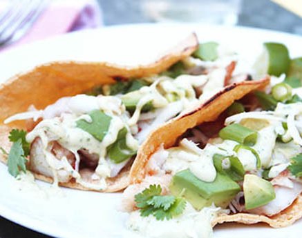 To make tacos, warm tortillas in a dry nonstick skillet over medium-high heat until they begin to brown. Pile together on a plate; cover and keep warm until ready to assemble. Place three pieces of fish in each tortilla. Drizzle with 1 tablespoon of crema and top with cabbage. Then add 1 tablespoon each of avocado and mango. Drizzle another tablespoon of crema over each taco and top with 1/2 tablespoon thinly sliced scallion.