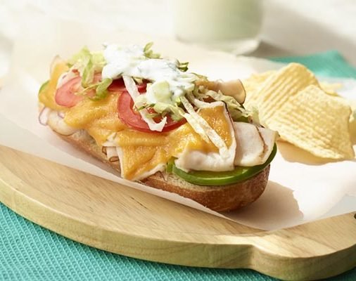 Use French rolls to make miniature turkey-cheese subs and top with a cucumber-yogurt sauce.