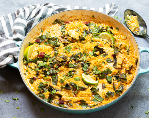 Meanwhile, combine Greek yogurt and turmeric until well combined. Add yogurt mix to chicken and rice mix once 15 minutes is completed, stir until well combined. Add more chicken stock if needed, should have a thick sauce consistency. Spread swiss chard ribbons evenly over top of dish. Cover and cook another 5 minutes until chard is wilted and rice is cooked through. Garnish with chopped cilantro and lime wedges if desired.