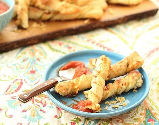 Mix melted butter and garlic powder together, brush onto twists and sprinkle each with Parmesan cheese. Bake for 18-20 minutes or until golden brown and cheese is bubbly on top. Serve with marinara sauce.