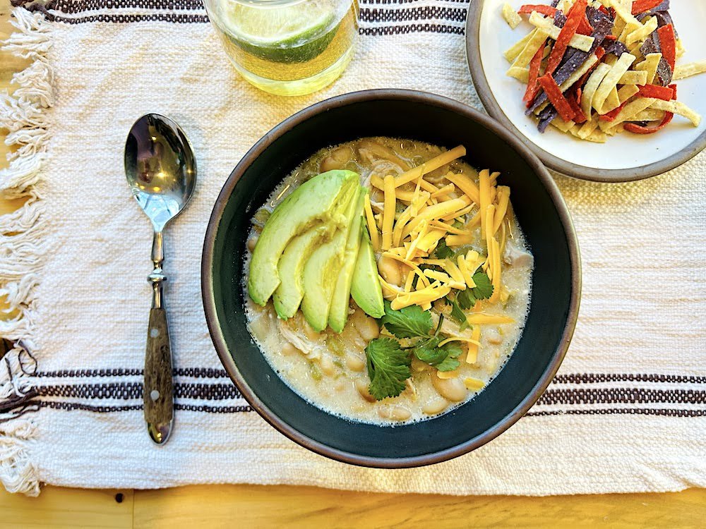Quick and easy soups and stews are in constant rotation in my kitchen as soon as the fall temps start to drop, and my favorites are ones like this chili that satisfy my craving for comfort food while being packed with protein and fiber. A little different from other chicken chili recipes, this one uses chicken thighs which add heartiness, and it calls for pureeing some of the beans to add creaminess. If desired, skinless, boneless chicken breasts – or a mix thighs and breasts – can be substituted.