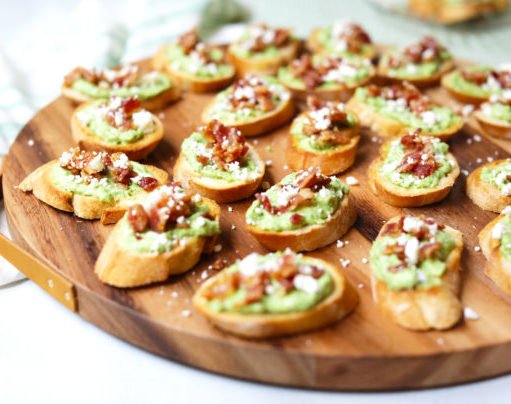 To serve, spread each crostini with sweet pea mixture, approximately one heaping tablespoon per slice. Top with bacon crumbles and sprinkle of feta cheese. Place crostini on serving platter. If making ahead of time, place in air tight container and refrigerate for up to 48 hours.