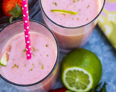 Combine milk, frozen strawberries, banana, orange juice, lime juice and ice cubes in blender. Blend until smooth and frothy.