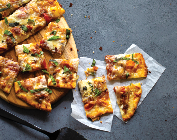 Salty Italian bacon, caramelized onions and fontina cheese make this crisp-chewy flatbread unforgettable. Cut into small squares to make the perfect shareable snack or appetizer.