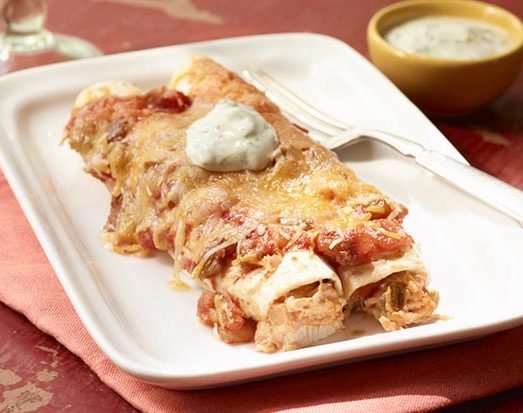 These easy, mouth-watering enchiladas are stuffed with cheese, chicken and salsa and topped with yogurt, cilantro and cumin.