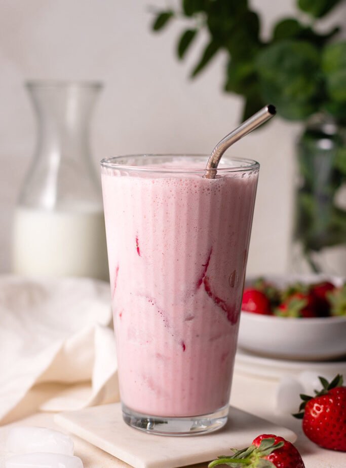 Place ice in a tall glass and pour milk mixture over ice. Stir in sliced strawberries.